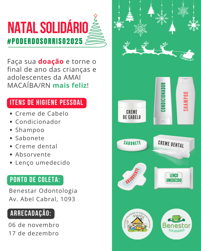 Mais uma vez, a Benestar Odontologia tem a alegria de apoiar a AMAI – Associação Macaibense de Acolhimento Institucional, uma organização que desde 2013 acolhe crianças e adolescentes encaminhados pela Vara da Infância e Juventude da Comarca de Macaíba e pelo Conselho Tutelar.